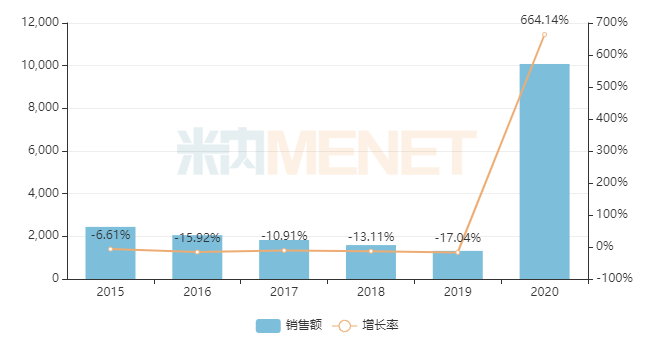 2015-2020年重點省市公立醫院貝伐珠單抗年度銷售趨勢(單位:萬元)